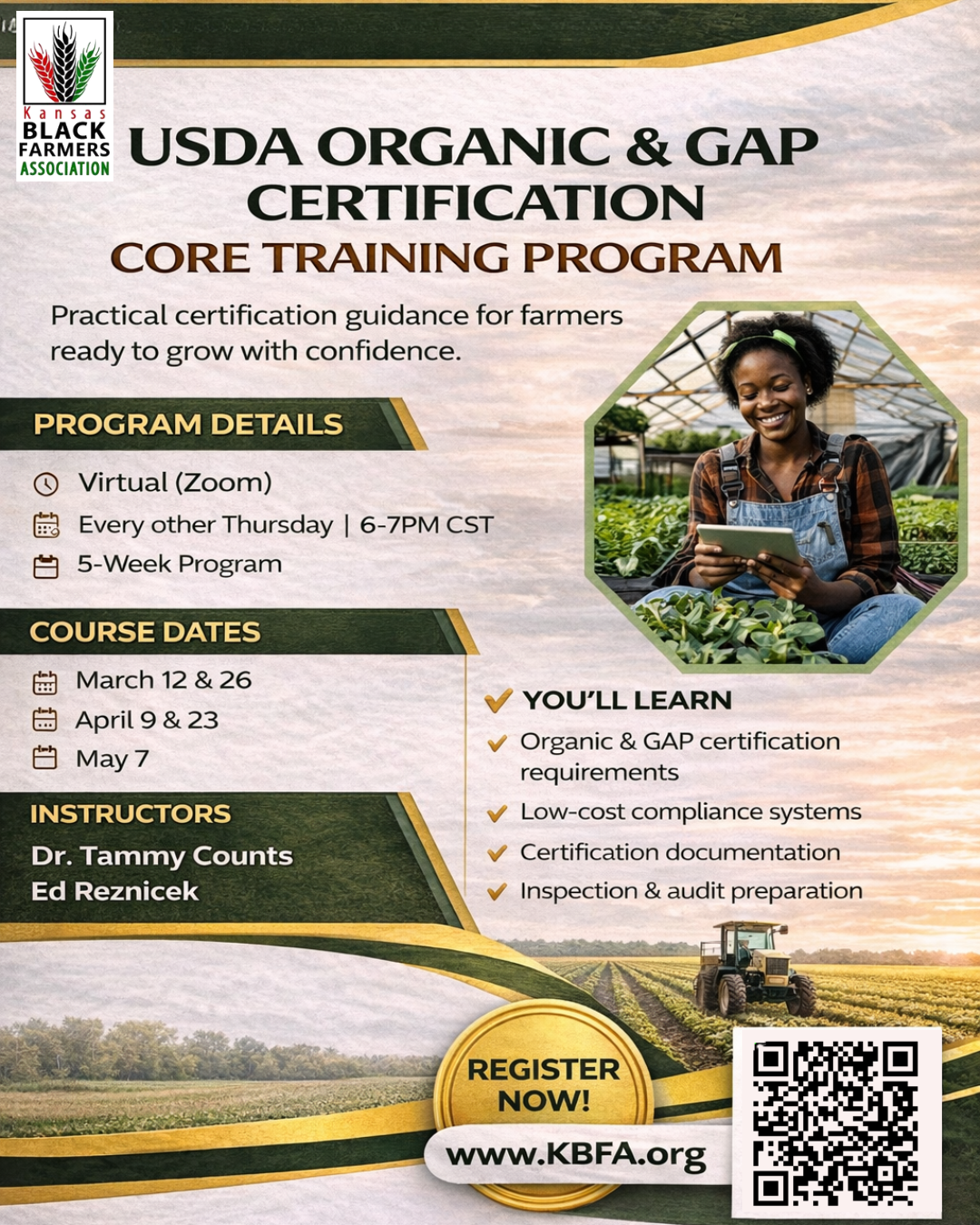 The Kansas Black Farmers Association (KBFA) continues its agricultural education through its USDA Organic & GAP Certification Core Training Program, a 5-week virtual series designed to help farmers strengthen their knowledge of certification requirements and inspection readiness. This program offers practical instruction on Organic and GAP standards, documentation development, and low-cost compliance systems, supporting producers in advancing their operations and expanding market opportunities.
